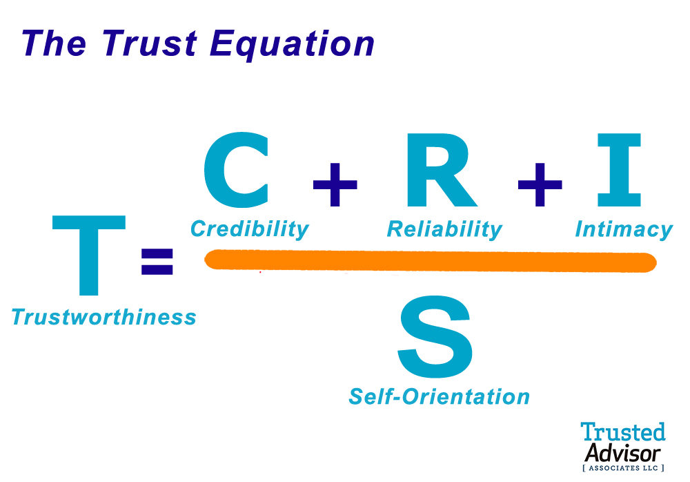 It turns out trust isn’t a “fixed” concept. My friend, Charlie Green, is probably one of the best in the world on this. The “trust equation,” provides us insight into the variability of trust across situations and time: Trustworthiness= (Credibility + Reliability + Intimacy)/ (Self Orientation)