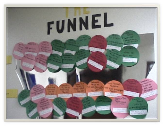 - Consider a “paper” representation of your funnel–draw a funnel with your sales process stages. Write down the number of deals you need for a healthy funnel (in big bold numbers). With little “yellow stickies” write down every deal, the date it started, the projected close date, and the value. As deals progress, move them down the paper. Post that on the wall of your office.