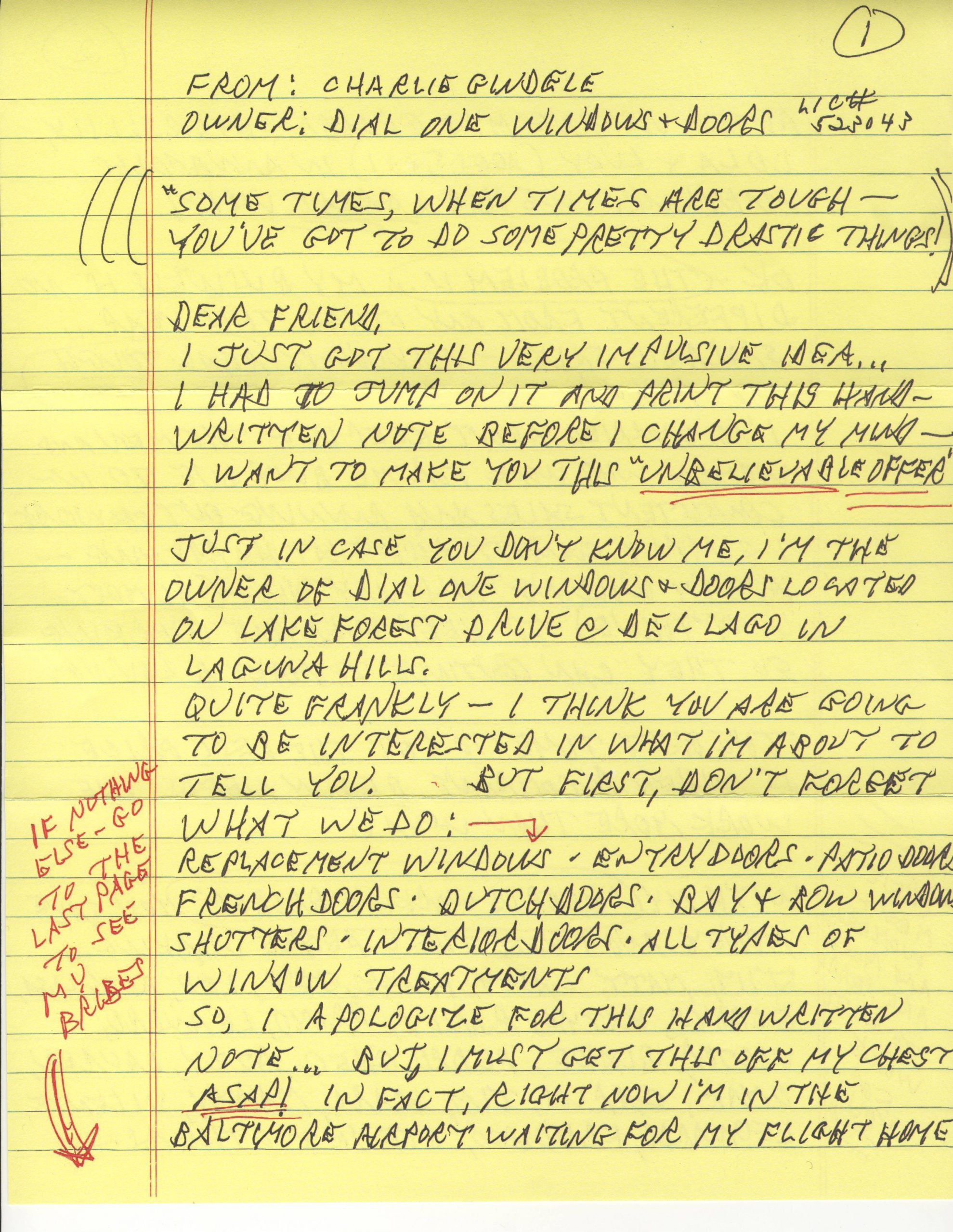 I have to admit, they achieved one objective–they got me to read the letter–not only once but 4 times. While I read it 4 times, mostly in sheer amazement, each time, it made me angrier because I recognized I was being manipulated. The letter appeared to be from a frustrated small business owner, doing whatever he could to generate business. “When times are tough, you’ve got to do some pretty drastic things!” His impulsive idea was to send this “handwritten letter.” He was so excited, he had to “hand write a note” He clearly wanted me to know it was handwritten, because he reminded me of the fact at least 3 times in the 4 page diatribe. He also managed to tell me the name of all his employees, who would appreciate my business to keep them employed, and the names and ages of his granddaughters.