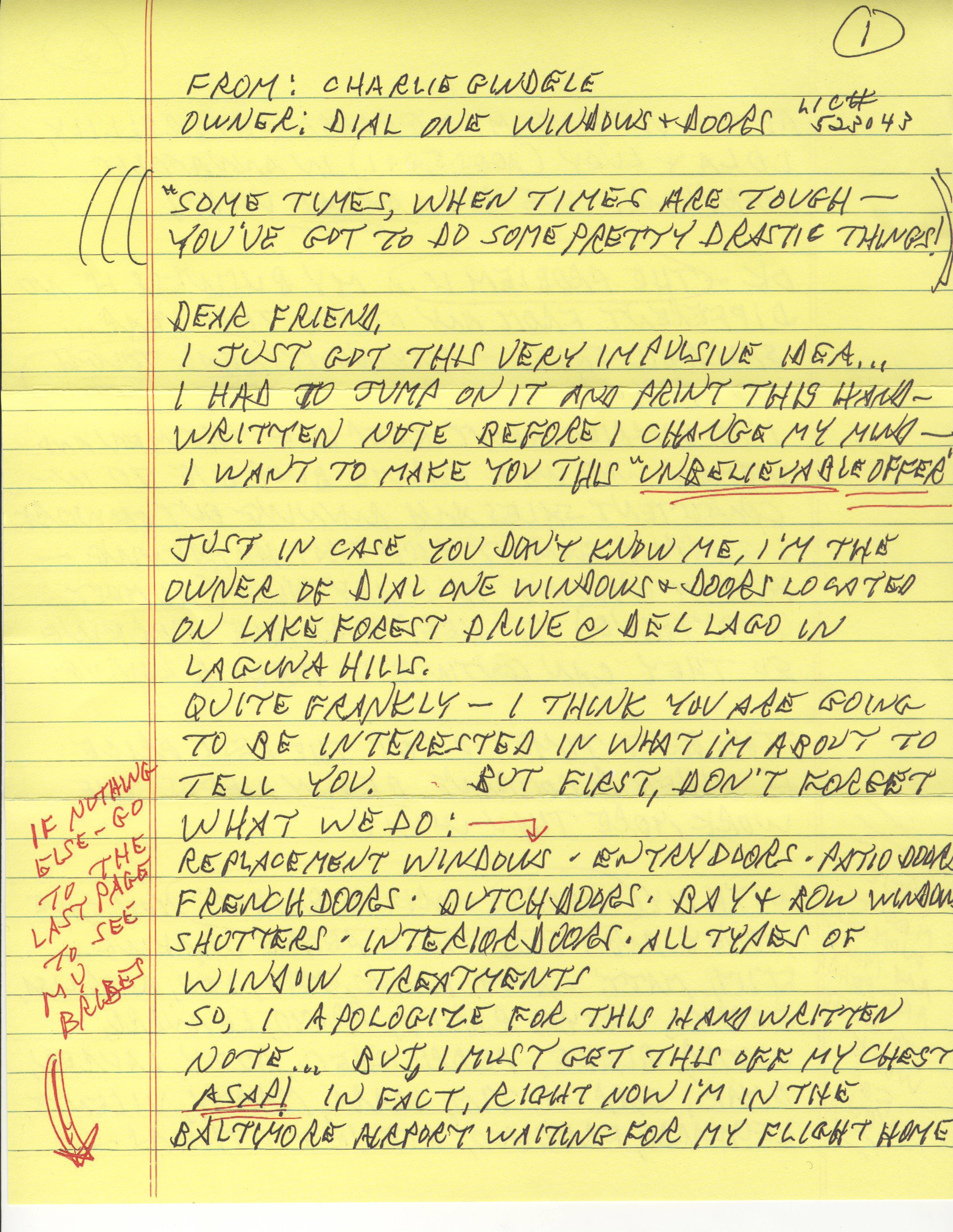 I have to admit, they achieved one objective–they got me to read the letter–not only once but 4 times. While I read it 4 times, mostly in sheer amazement, each time, it made me angrier because I recognized I was being manipulated. The letter appeared to be from a frustrated small business owner, doing whatever he could to generate business. “When times are tough, you’ve got to do some pretty drastic things!” His impulsive idea was to send this “handwritten letter.” He was so excited, he had to “hand write a note” He clearly wanted me to know it was handwritten, because he reminded me of the fact at least 3 times in the 4 page diatribe. He also managed to tell me the name of all his employees, who would appreciate my business to keep them employed, and the names and ages of his granddaughters.
